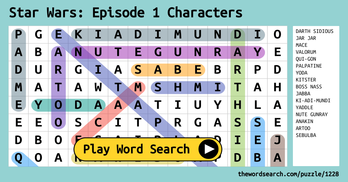 Star Wars Episode 1 Characters Word Search from thewordsearch.com